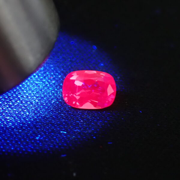 UVライトを当てると、まるで光が宿ったように強い蛍光を放つのもこのルースの魅力。