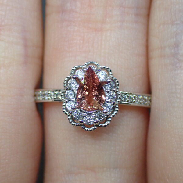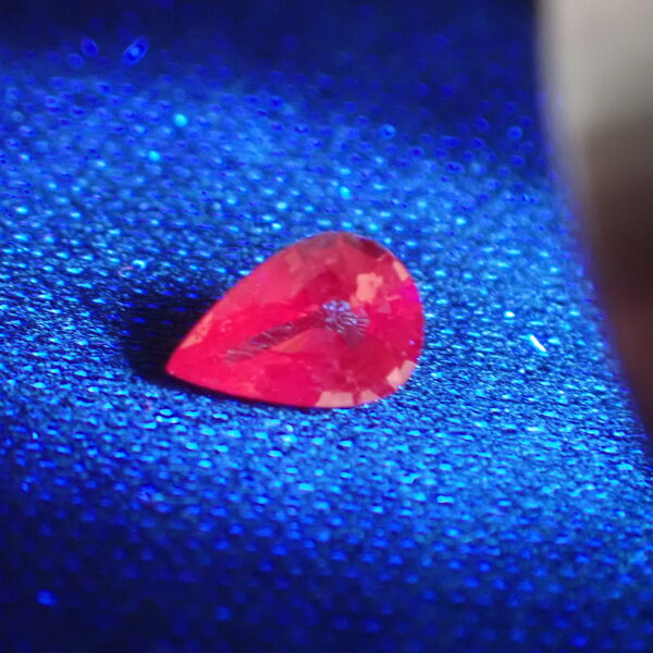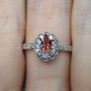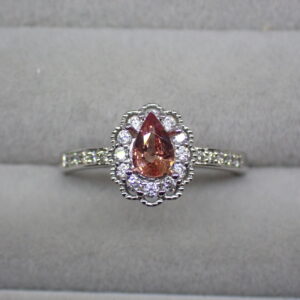 しかし、パパラチアサファイアとしてはウィンドウが少ないルースで、目で見てもそれほど目立たず、枠に乗せたりするとほとんどわからなくなる程度です。