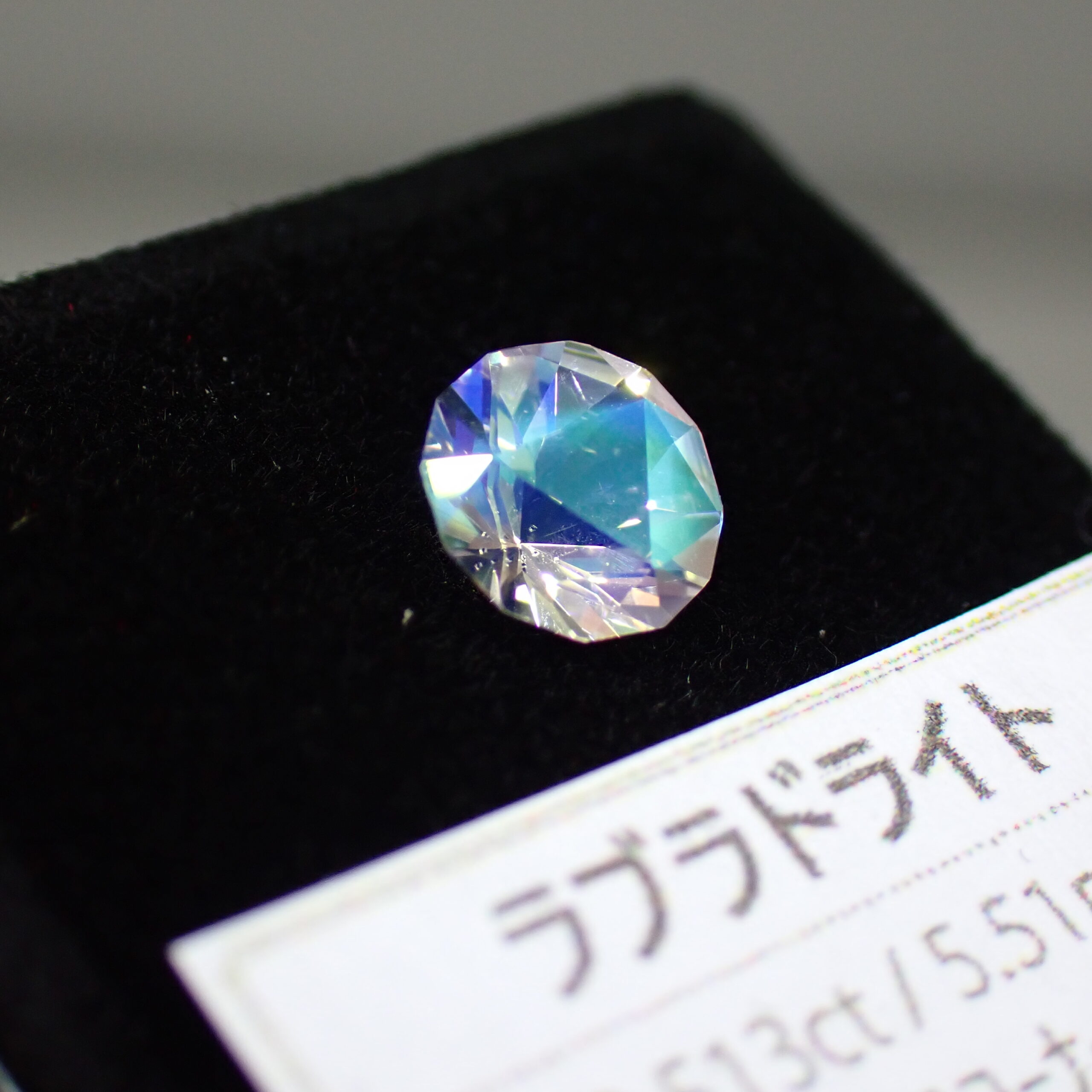ルースの裏側のカット面に反射してグリーンから水色のラブラドレッセンスが出ており、角度を変えると鳥が羽ばたいているようにも見えます。