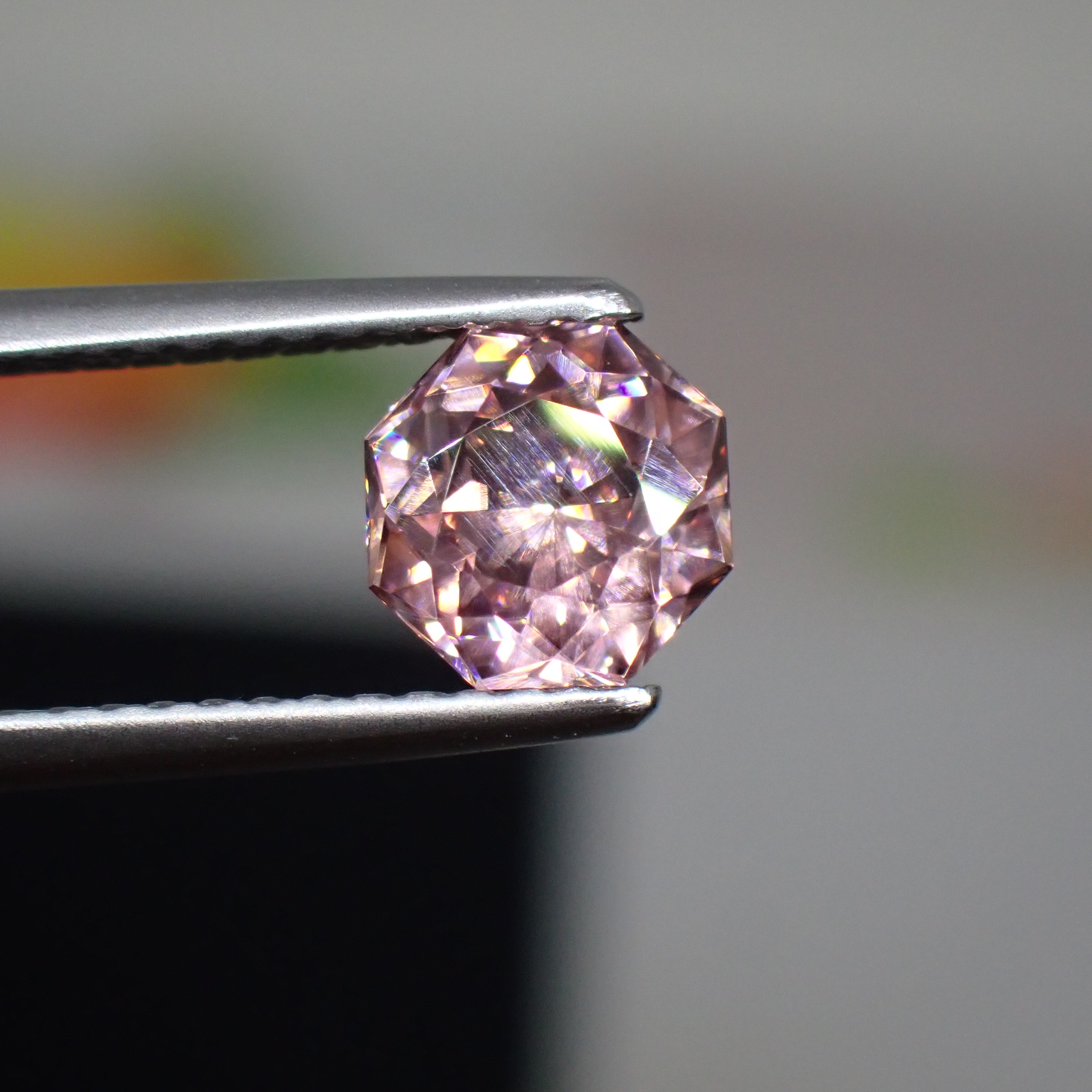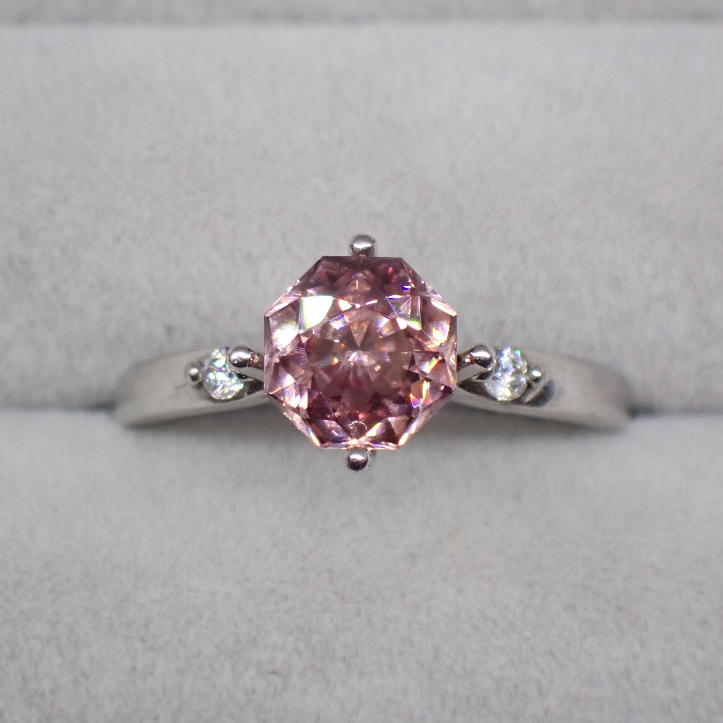 ジルコンはダイヤモンドに匹敵する高い分散を誇るため、商業施設の照明下ではファイア(虹色の煌めき)がビビッと鮮烈に。中でもイエロー・オレンジ・ピンクのファイアが際立って視認でき、思わず目を奪われます。