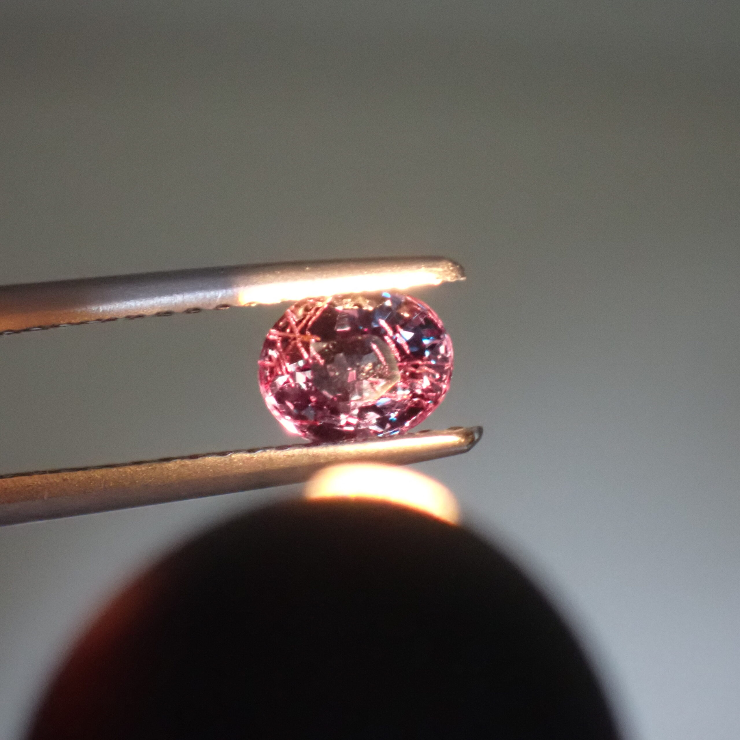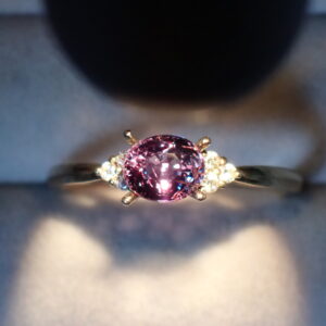 部屋の光でも強く輝く神秘的なカラーチェンジガーネット。白熱灯によるカラーチェンジを楽しめます。