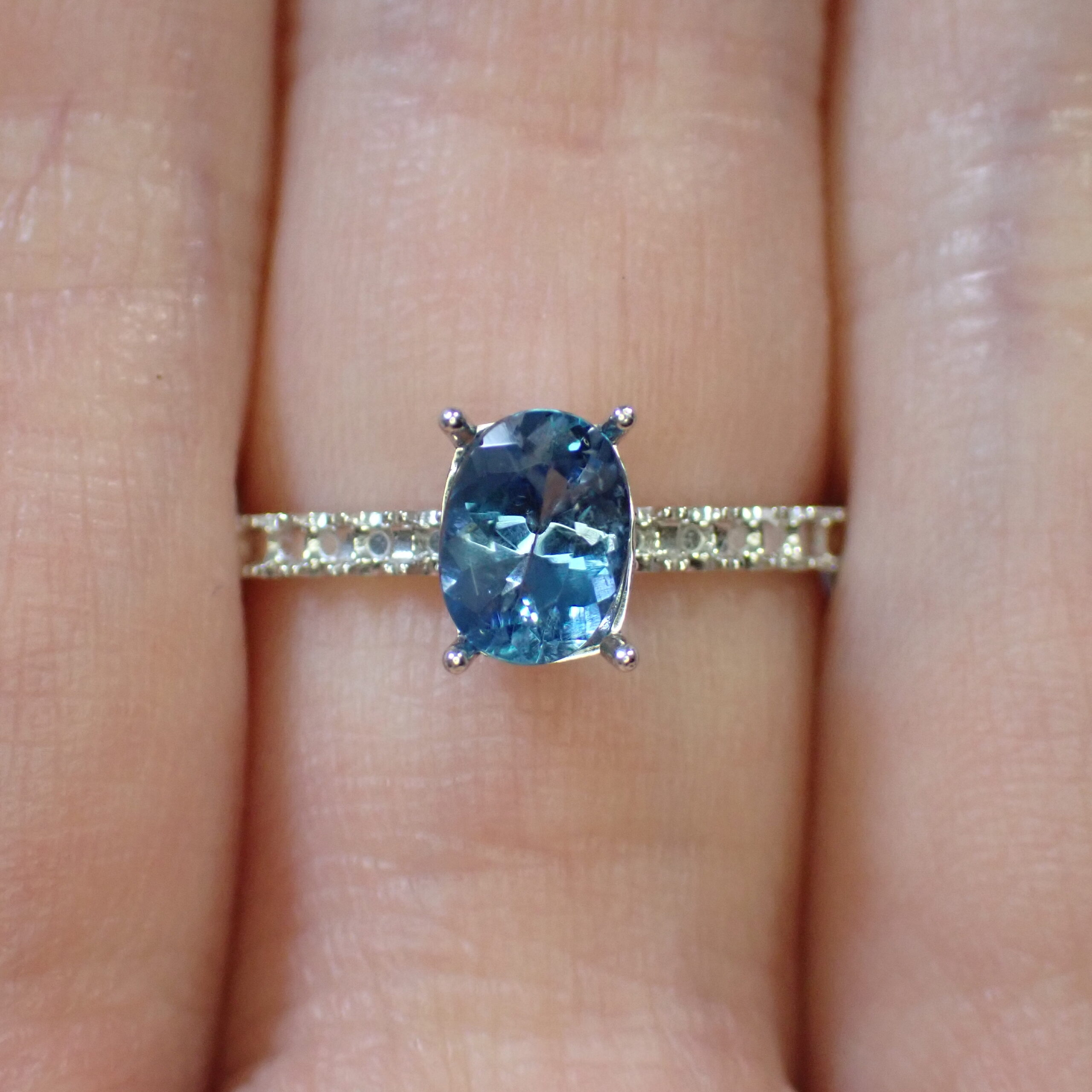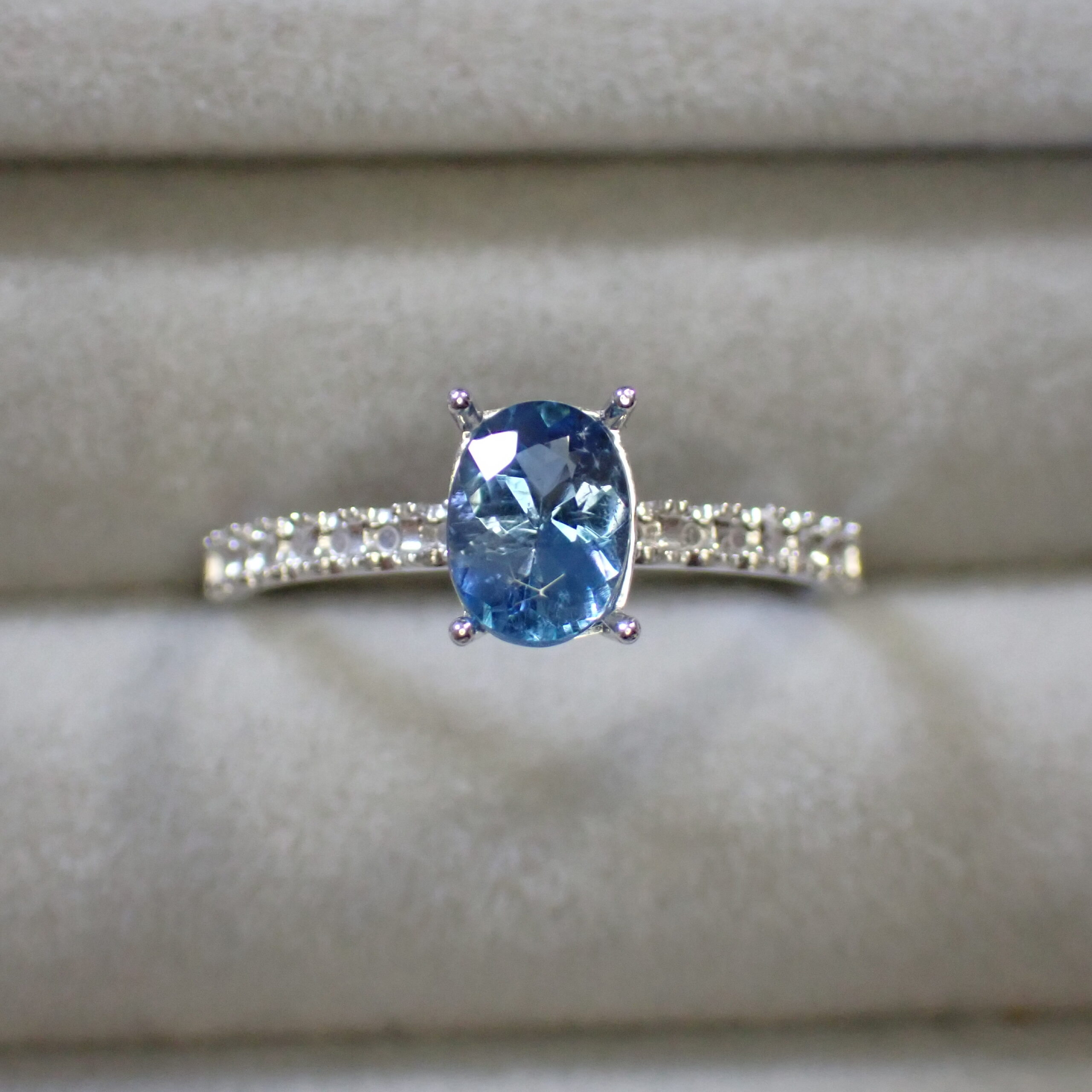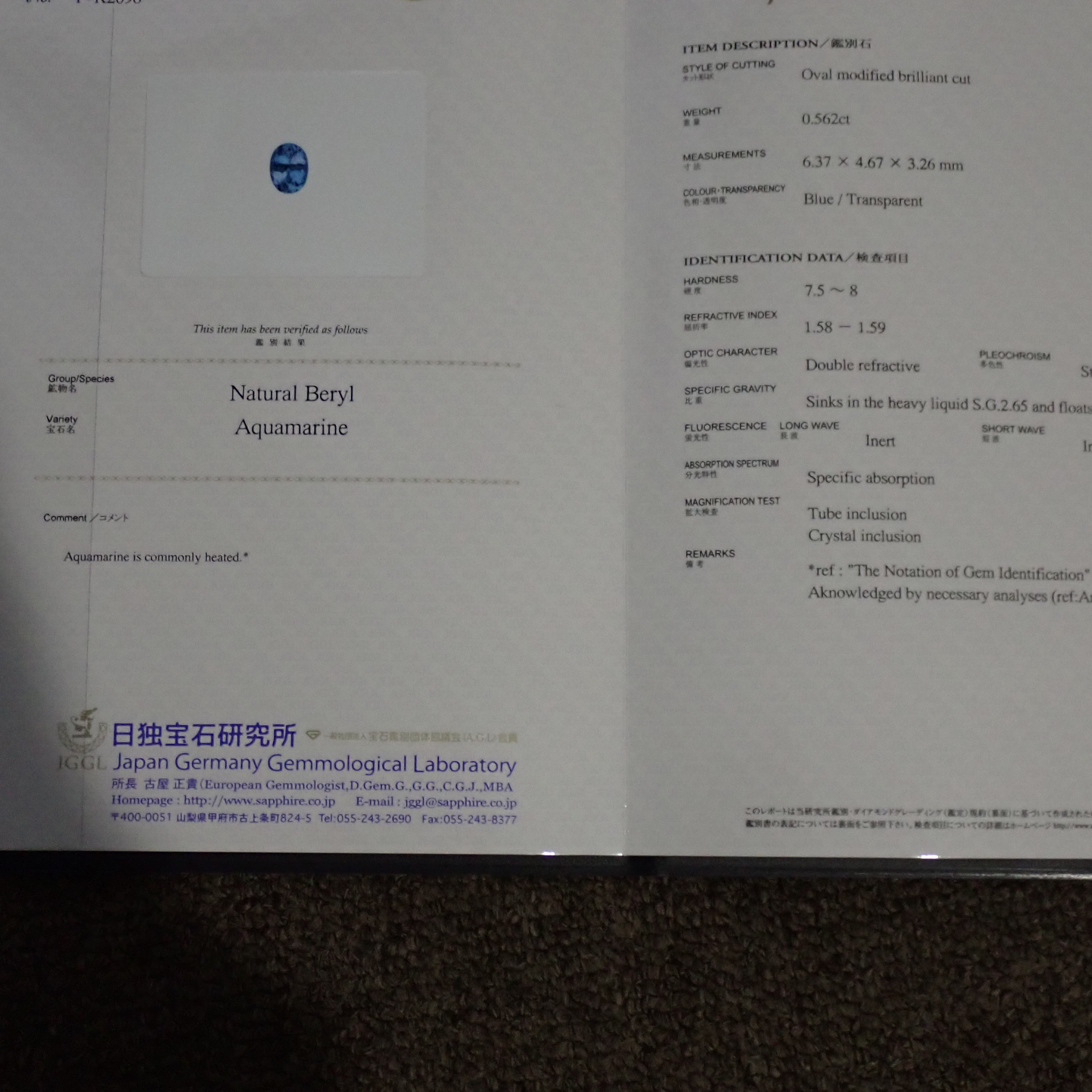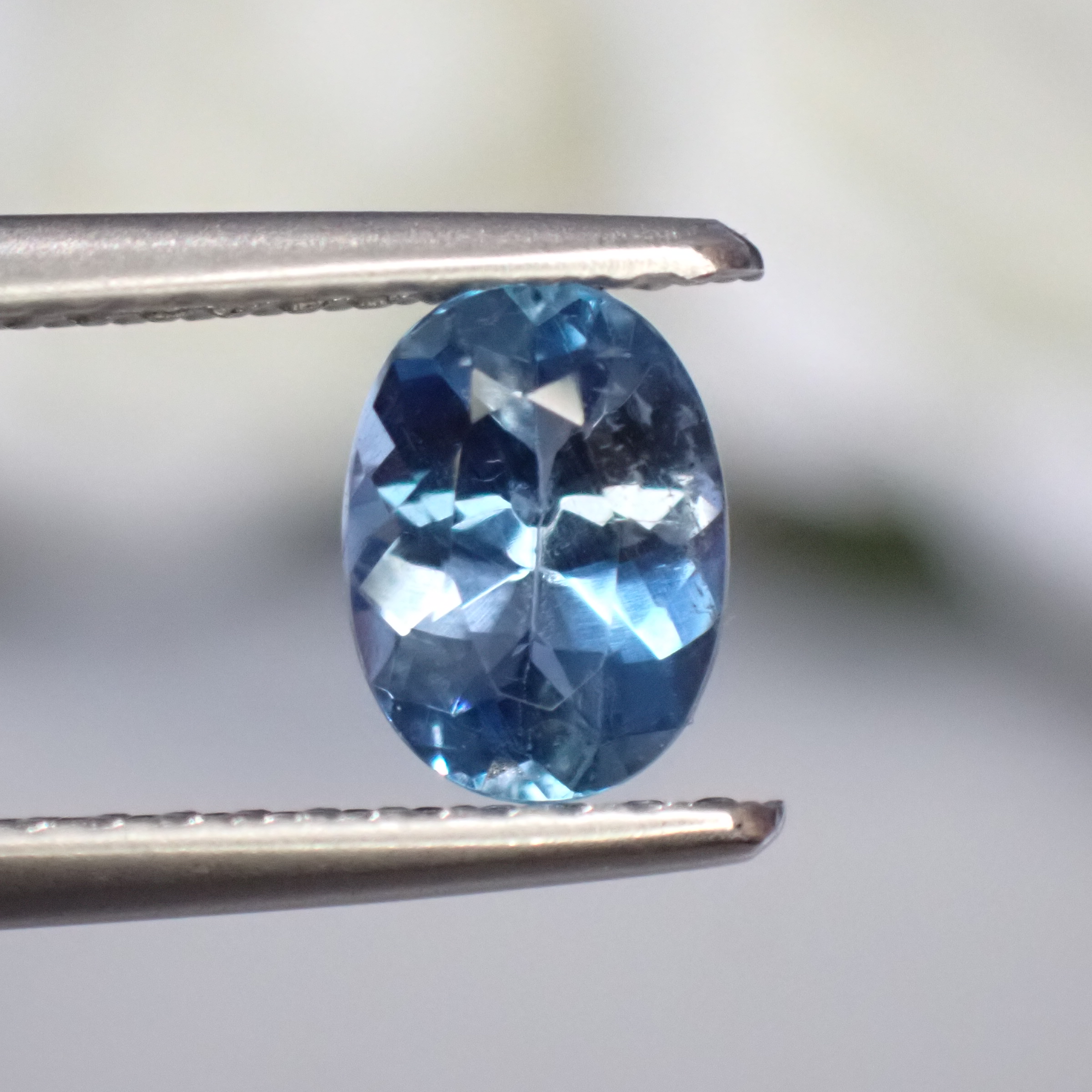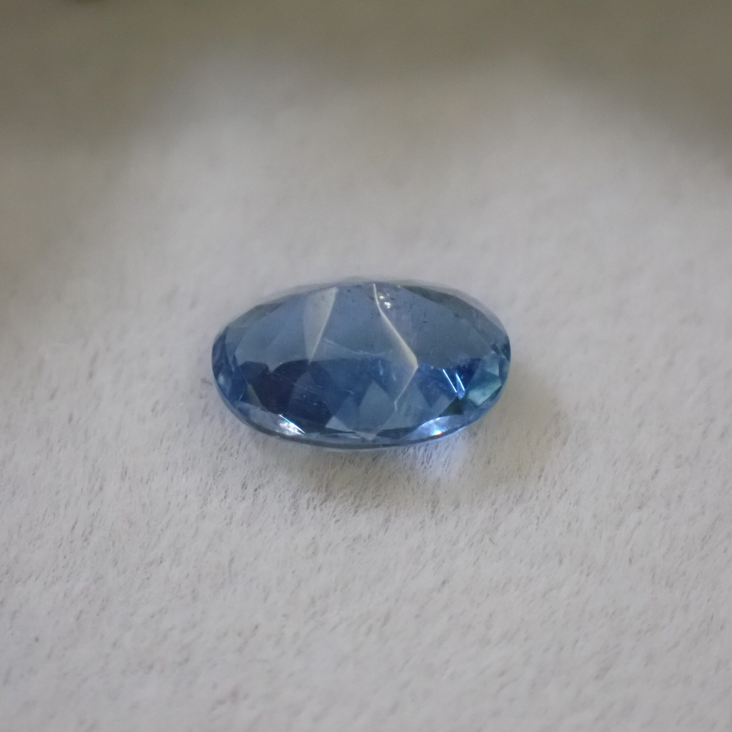 10倍ルーペで見ると海の中の気泡のようなインクルージョンや裏面にちいさなキャビティ、白い線状のインクルージョンが確認できますが、肉眼ではほとんど確認困難なレベル。その澄んだ透明度はジュエリー加工にも自信を持っておすすめできるクオリティです。