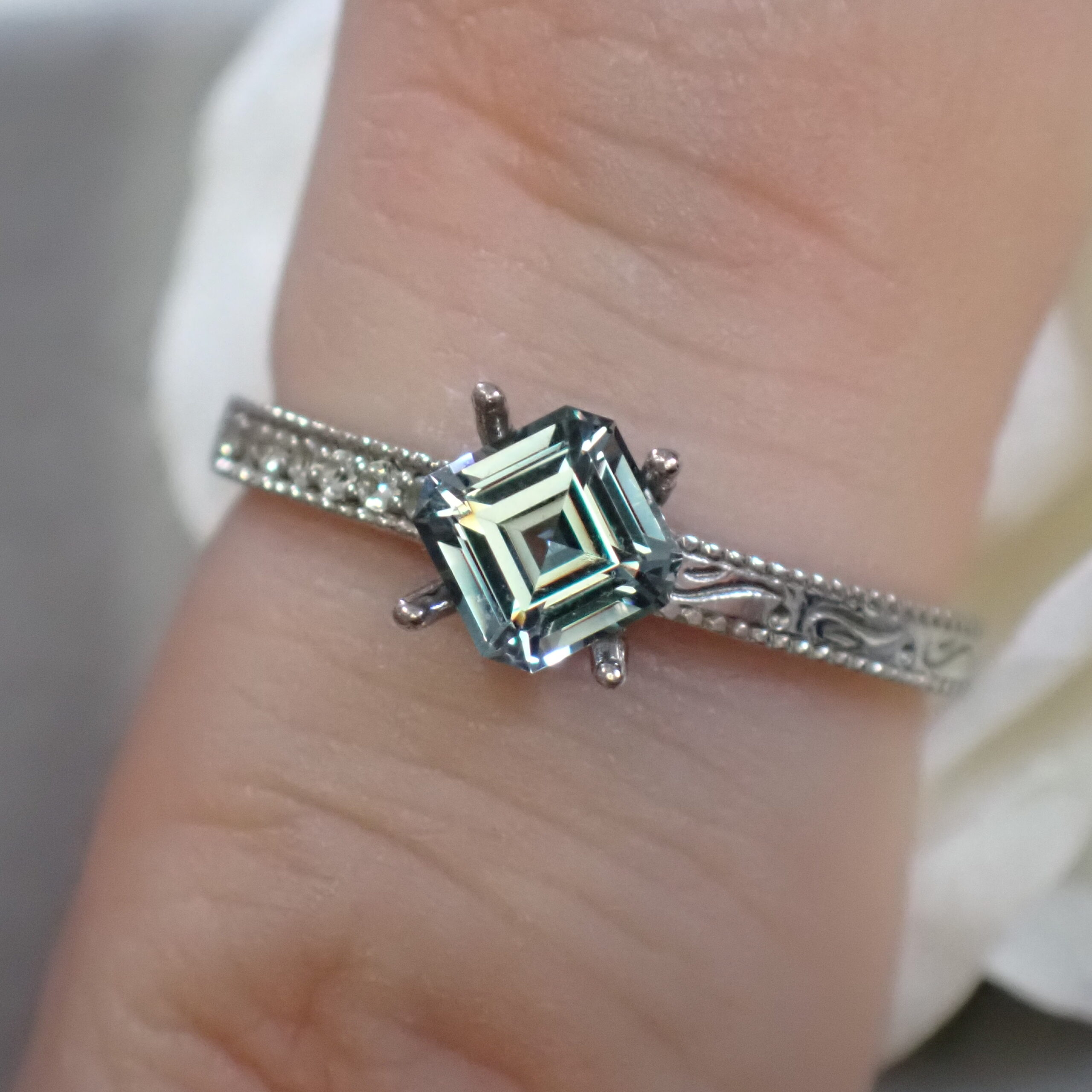 光があたると、スクエアエメラルドカットから放たれるネオン管のような力強い輝きが見えます。