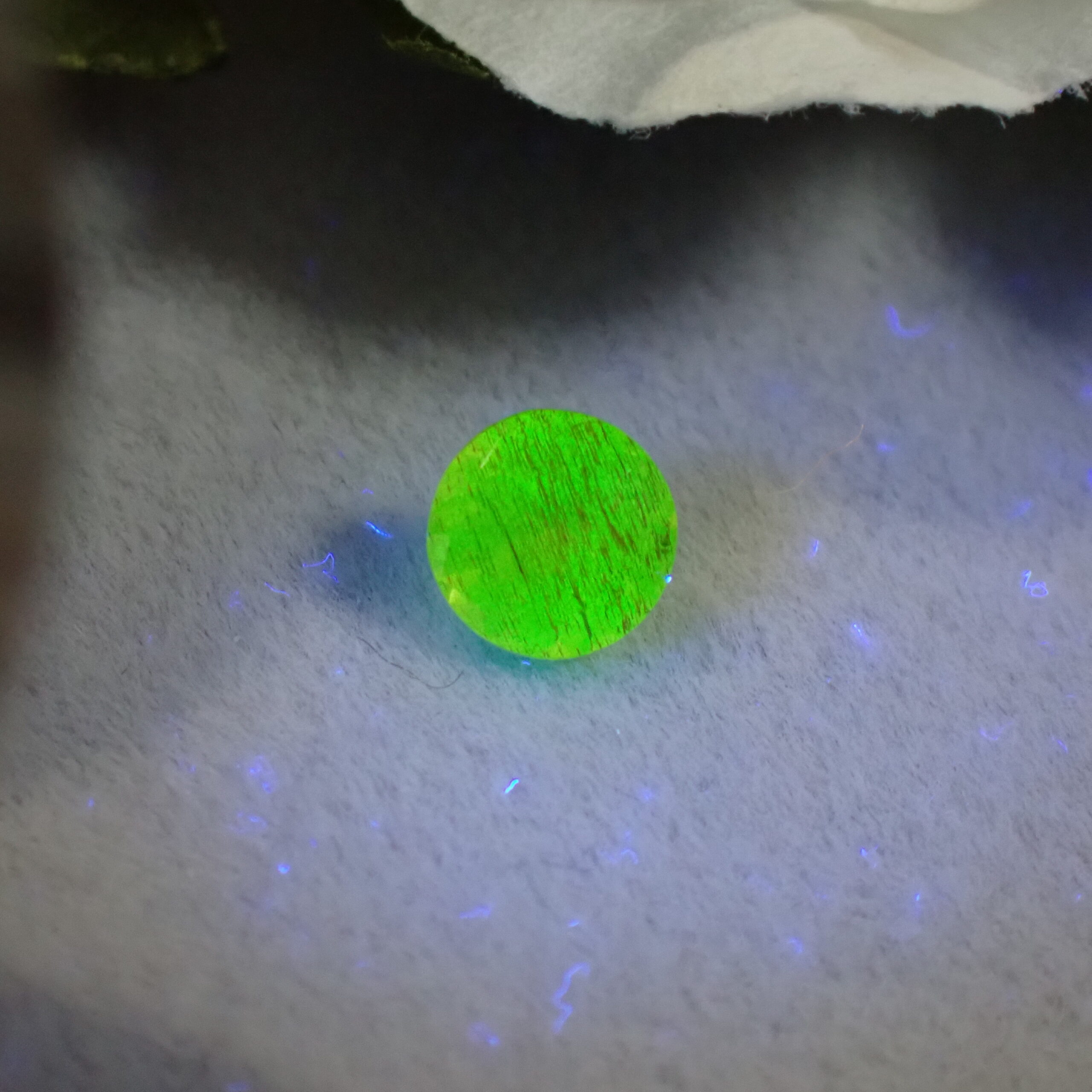 UV(ブラックライト)を照射した瞬間、まるで電気信号を受けたかのように、強烈なネオングリーンがルース全体から溢れ出します。その激しい輝きは、一度見ると忘れられない衝撃的な光景です。